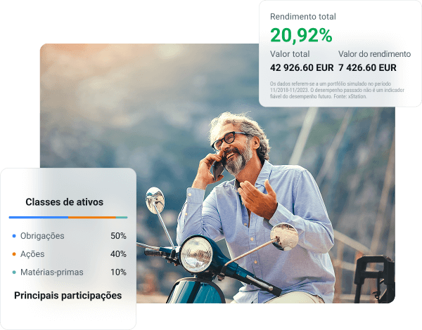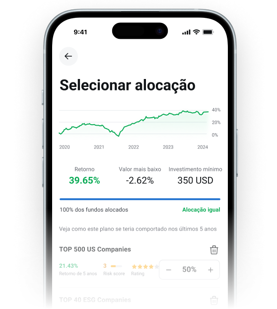 Crie o seu Plano de Investimento Internacional de maneira simples, graças a uma interface intuitiva que te guiará passo a passo. Comece a investir a partir de 15 USD (ou o equivalente na moeda da conta).