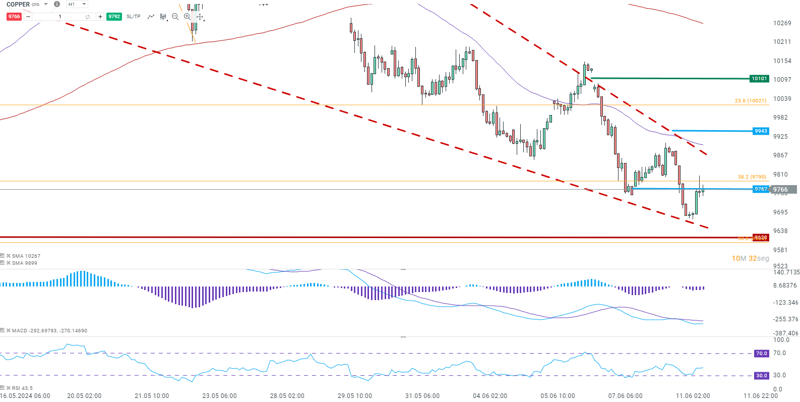El precio del cobre ha estado en una trayectoria descendente, con un intento reciente de recuperar el nivel de 9767. Sin embargo, la resistencia clave en 9943 y las medias móviles sugieren que los osos aún tienen el control. El RSI se encuentra en 43.5, lo que indica que hay espacio para más movimientos bajistas. El MACD también respalda la continuación de la tendencia bajista a corto plazo.