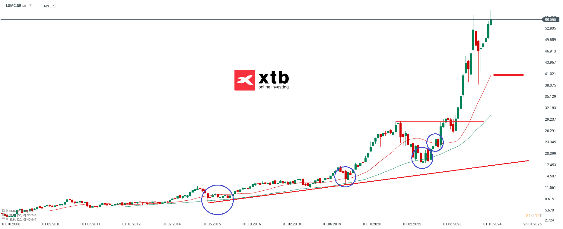 El fondo ha mostrado una tendencia alcista constante durante meses. ¡La rentabilidad anual de aproximadamente un 73% es impresionante! Aunque hubo tres meses en 2024 con velas mensuales rojas, estas pérdidas fueron rápidamente recuperadas. El ETF mostró un crecimiento dinámico el año pasado, alcanzando un máximo de 56,23 EUR a mediados de junio de 2024. Sin embargo, posteriormente se produjeron tomas de ganancias significativas, estabilizándose en torno a los 38,22 EUR. Después, experimentó un movimiento de alivio que inicialmente fue vendido, pero a partir de octubre de 2024, el interés de compra se reactivó, llevando al ETF a un nuevo máximo de 57,62 EUR en esta semana de negociación.