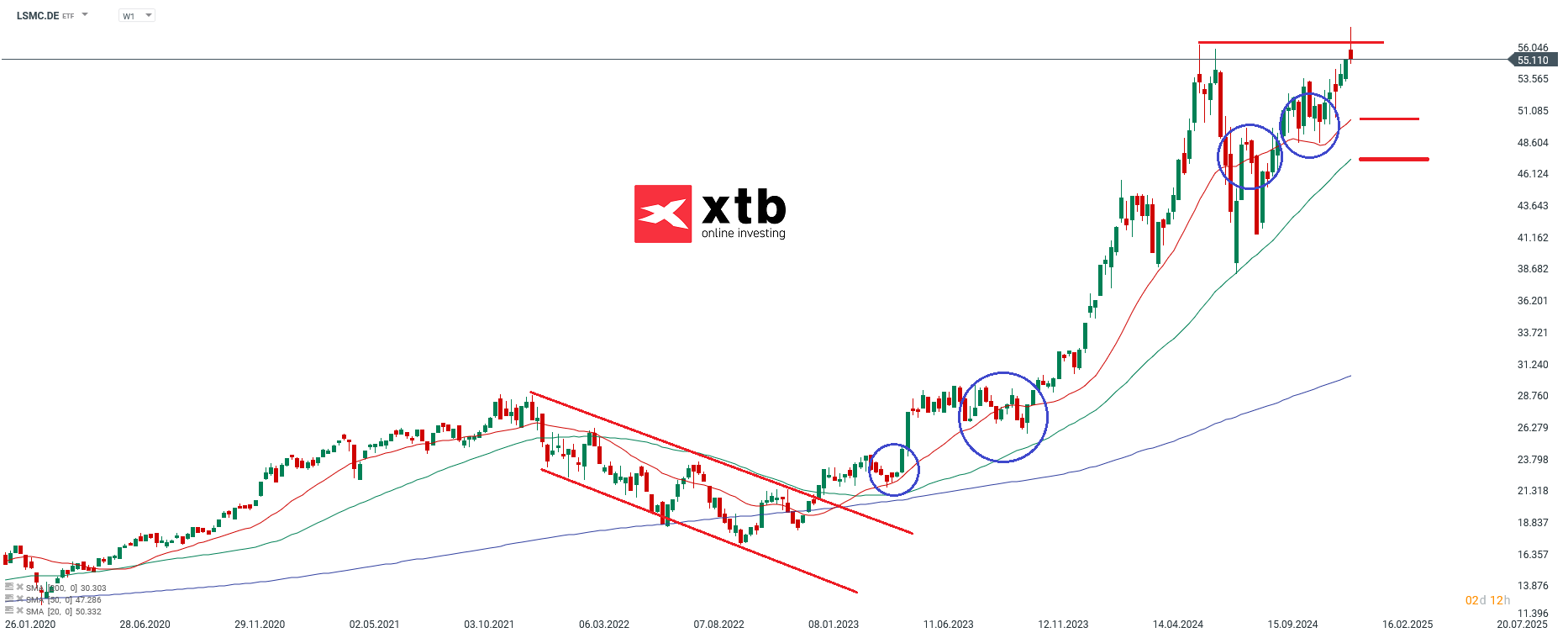 En el gráfico semanal se observa que, en 2023, el ETF logró situarse por encima de la SMA20 (actualmente en 50,33 EUR), aunque tomó tiempo para ganar impulso. Esta dinámica llevó al alza hasta mediados del año pasado, mientras que la corrección alcanzó la SMA50 (actualmente en 47,29 EUR). El gráfico muestra claramente que la mecha de la vela semanal tocó exactamente esta línea promedio. Desde noviembre de 2024, el fondo cotiza por encima de la SMA20.