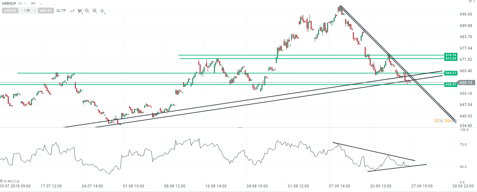 En este contexto, con un Dólar subiendo a nivel internacional y un Cobre corrigiendo desde los máximos de los últimos dos meses, continua pareciendo el entorno más sensato un rebote en el USDCLP desde las inmediaciones de los 660 Pesos por Dólar. Técnicamente el par continua en la zona de soporte, estrangulado por la tendencial alcista del medio plazo. Por otro lado, encontramos divergencias alcistas en los principales osciladores.