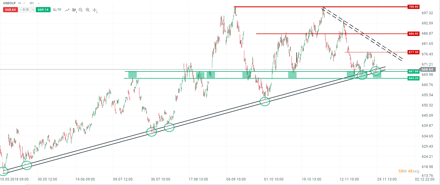 Por el lado del Peso, vemos como el movimiento ha dejado al USDCLP cotizando sobre la tendencia alcista y el gran soporte ( alrededor de 665 Pesos por Dólar). Desde estos niveles, veremos como se comporta el Dólar, y hacía donde se desliza el mercado. En caso de rebote del Dólar, podríamos ir a atacar una vez más la zona psicológica de los 700 USDCLP.