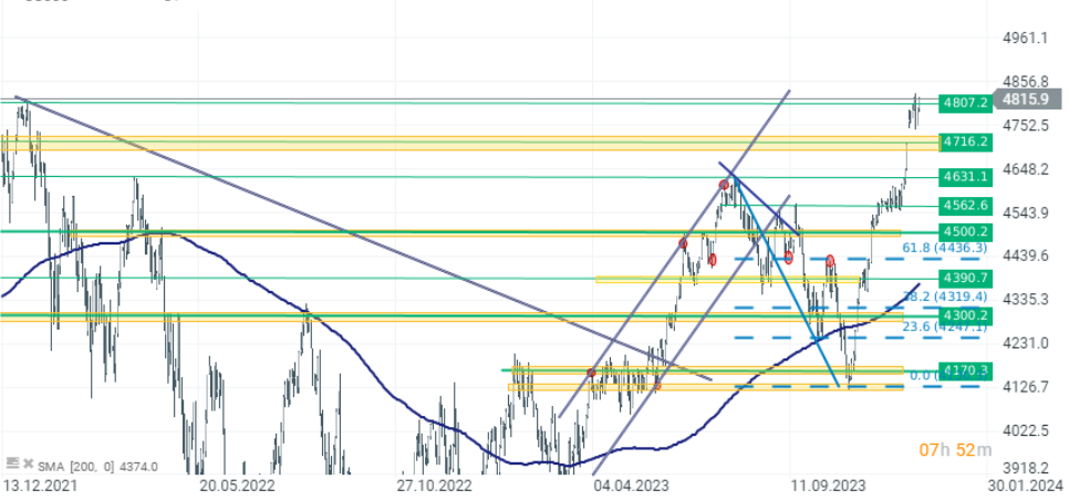 El S&P500 prueba de nuevo sus máximos históricos por encima de los 4810 puntos. Si los alcistas logran mantener estos niveles en el cierre diario, será el cierre histórico más alto. En cuanto a los niveles de soporte, el área de 4.700 es ahora el primer soporte a la vista.