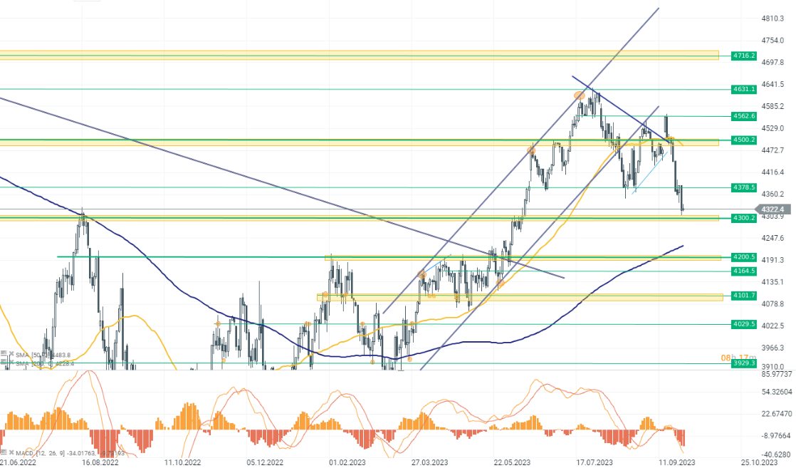 El S&P 500 cotiza actualmente a 4330 puntos, mostrando un aumento del 0,30% hoy, después de dos semanas de caídas sustanciales. El índice experimentó una caída desde la línea de resistencia alrededor de 4560 puntos, y las caídas se detuvieron en un nivel de soporte crucial cerca de 4300 puntos. Si se supera esta zona de soporte y el precio del índice cae por debajo de ella, el siguiente nivel clave a monitorear es alrededor de 4200 puntos, lo que marca un área significativa que potencialmente podría entrar en juego a medida que el mercado busca una mayor dirección.