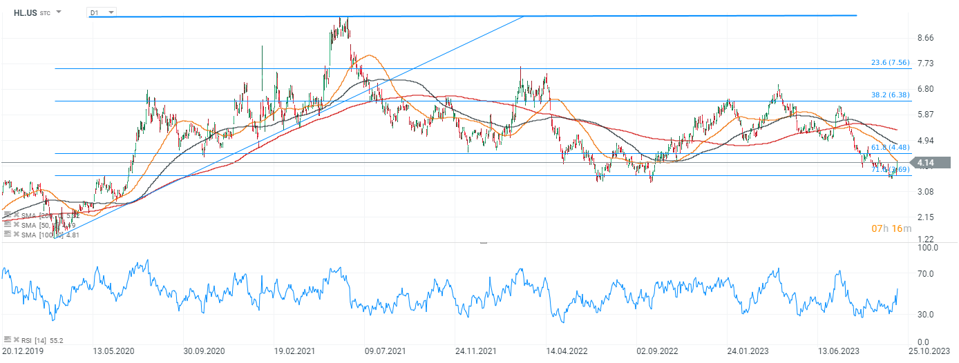 Gráfico de Hecla Mining (HL.US). Las acciones están rebotando dinámicamente desde los 3,7 dólares, que anteriormente también resultó ser el mínimo de sobreventa de 2022 (dos veces): la acción está subiendo actualmente un 13,5 % y el precio se acerca a la SMA50 (línea naranja), cuya superación puede no abrirse. El camino para los alcistas incluso a niveles superiores a 5 dólares por acción (SMA200, línea roja). Fuente: xStation5