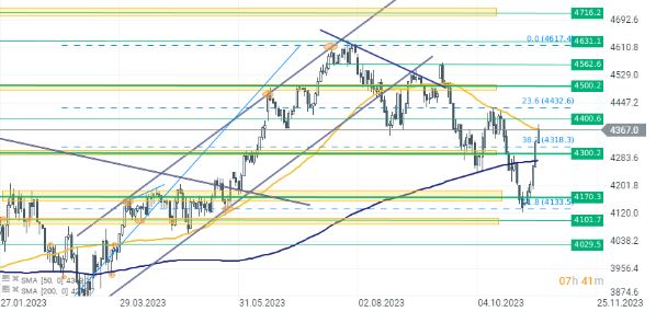 El SP500 está subiendo hoy un 1,0%. El índice lleva 5 días de beneficios, ganando un total del 5,20%. Se ha defendido el nivel de soporte de 4170 puntos. Este nivel coincidió con el retroceso de Fibonacci del 61,8% de la última tendencia alcista. Significa que formalmente todavía estamos en una tendencia ascendente. El nivel clave a tener en cuenta es la resistencia en 4370-4400 puntos, donde nos encontramos actualmente. Fuente xStation 5