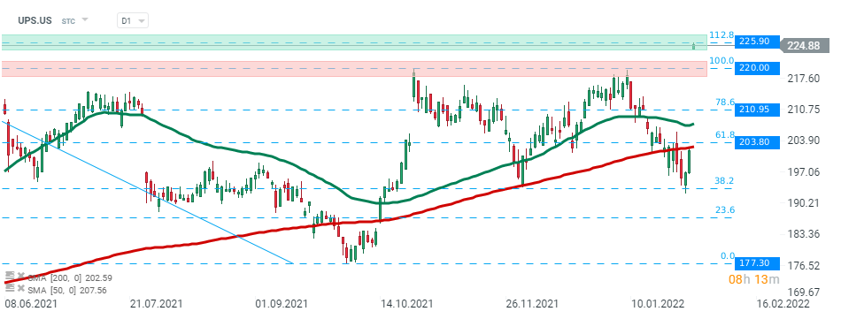 Las acciones de United Parcel Service (UPS.US) lanzaron la sesión de hoy con una brecha de precios alcista masiva y alcanzaron un nuevo máximo histórico de $225,90, lo que coincide con un retroceso externo de Fibonacci del 112,8 % de la corrección a la baja lanzada en mayo de 2021. Fuente: xStation5