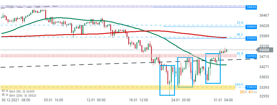 US30 lanzó el nuevo mes con un estado de ánimo optimista. El índice superó la resistencia principal en 34745 pts, lo que coincide con el retroceso de Fibonacci del 61,8% de la ola alcista lanzada en septiembre de 2021. Si prevalece el sentimiento actual, el próximo objetivo para los compradores se ubica en 35500 pts y coincide con la media simple de 200 (línea roja) y 38,2. % de retroceso. Fuente: xStation5