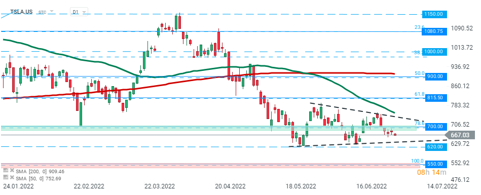 Las acciones de Tesla (TSLA.US) empezaron la sesión de hoy a la baja, por debajo de la resistencia clave en $ 700.00, lo que coincide con el 78.6% de retroceso de Fibonacci de la ola alcista lanzada en mayo de 2021. Si prevalece el sentimiento negativo, el límite inferior de la formación del triángulo debería actuar como soporte más cercano. Fuente: xStation5