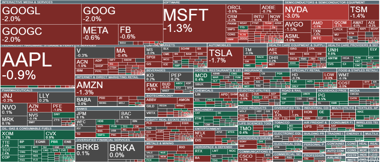 Acciones del índice S&P 500 clasificadas por sector e industria. El tamaño representa la capitalización de mercado. Los sectores con mejor desempeño son Oil&Gas, Machiner y Chemical, por otro lado está el sector de servicios y medios interactivos. Fuente: xStation5