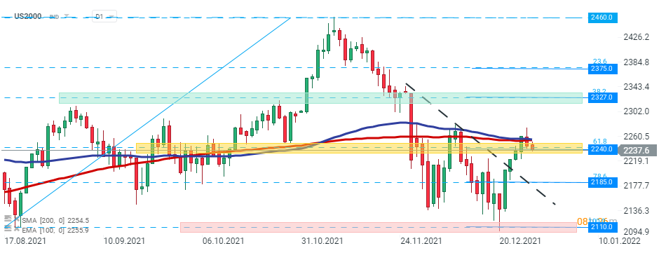 El US2000 no logró superar la SMA de 200 (línea roja) y retrocedió hasta el principal soporte en 2240 pts, que se ve reforzado por el retroceso de Fibonacci del 61,8% de la onda alcista iniciada en agosto de 2021. Si se produce una ruptura a la baja, el movimiento bajista podría acelerarse hacia el siguiente soporte en 2185 pts. Fuente: xStation5