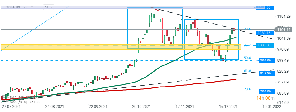 Las acciones de Tesla (TSLA.US) rebotaron en el principal soporte de 900,00 dólares la semana pasada y el precio consiguió superar rápidamente el nivel psicológico de 1000,00 dólares. Sin embargo, el lunes los compradores no lograron superar la línea de tendencia bajista y el precio retrocedió hasta el soporte local de 1080,75 dólares, que se refuerza con el 23,6% de Fibonacci de la onda ascendente lanzada a finales de mayo de 2021. Fuente: xStation5