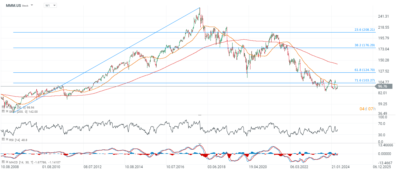 Las acciones de 3M (MMM.US) intentan hoy recuperarse desde los mínimos de varios meses. La acción cotiza a niveles cercanos a los mínimos de 2010.