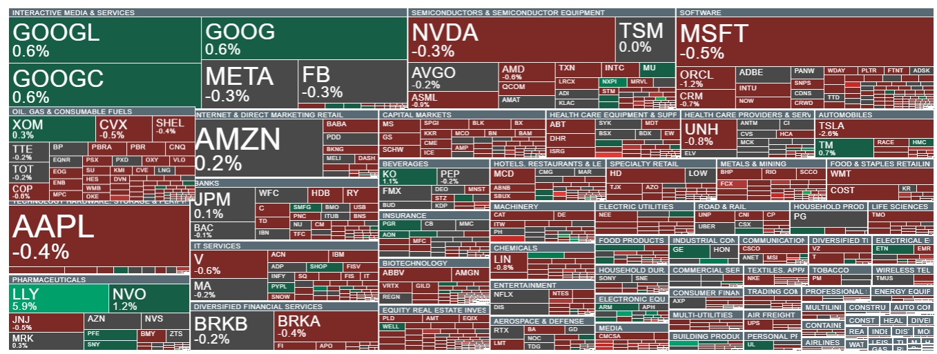 En general, el sentimiento de Wall Street es mayoritariamente débil en el día de hoy. Sin embargo, las acciones de Coca-Cola (KO.US) y Eli Lilly (LLY.US) suben tras los resultados, con alzas de casi el 6% gracias a ventas mayores de lo esperado de los medicamentos semaglutida. Entre las empresas de gran capitalización, destacamos a Tesla que cae casi un 3%.