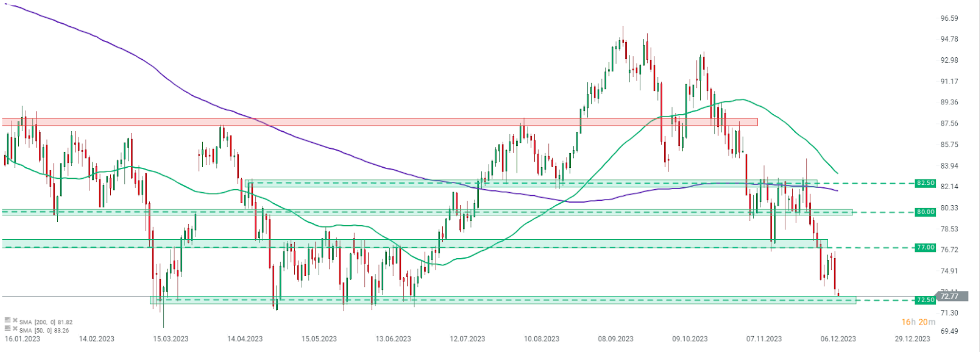 El Brent reanudó la caída después de una breve corrección alcista y busca probar la zona de soporte de $ 72,50.