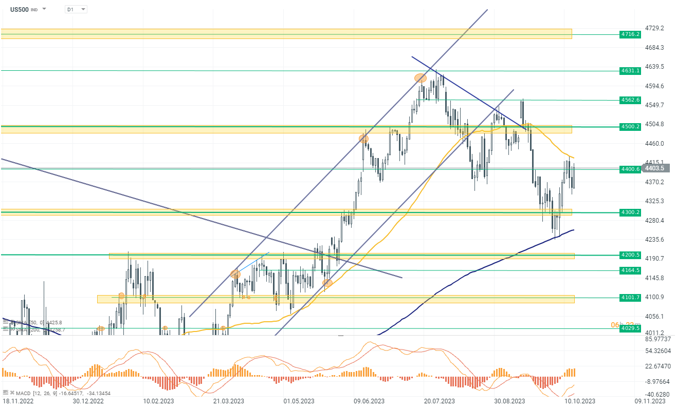 Para el S&P 500, la nueva semana se abrió con una larga vela alcista. El precio del índice ha vuelto por encima del nivel de 4400, que actualmente es una resistencia difícil de superar. Sin embargo, si se mantiene el sentimiento positivo, el próximo nivel que vale la pena observar es de 4500 puntos.