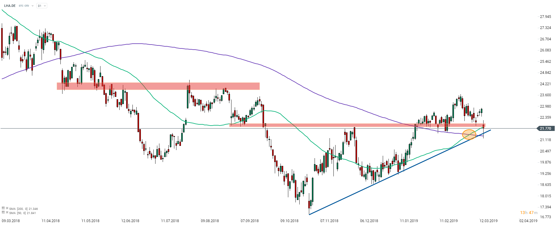 Lufthansa (LHA.DE) ha caído por debajo de la zona de soporte alrededor de 22€ al comienzo de la sesión de hoy. La tendencia bajista se vio frenada por la combinación de la media móvil de 200 sesiones y la tendencia alcista de la línea de tendencia. Hablando de media móvil, la media de 50 y 200 sesiones acaba de pintar una cruz dorada, patrón considerado alcista (círculo naranja). Fuente: xStation5