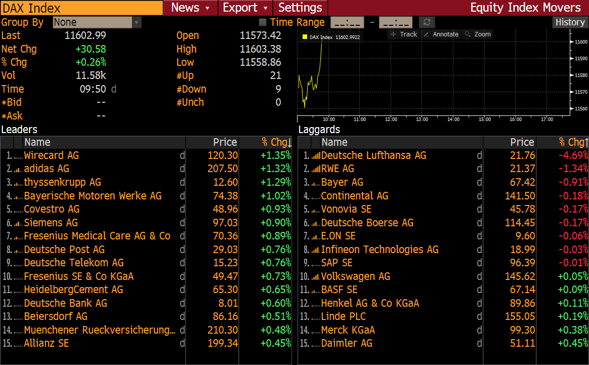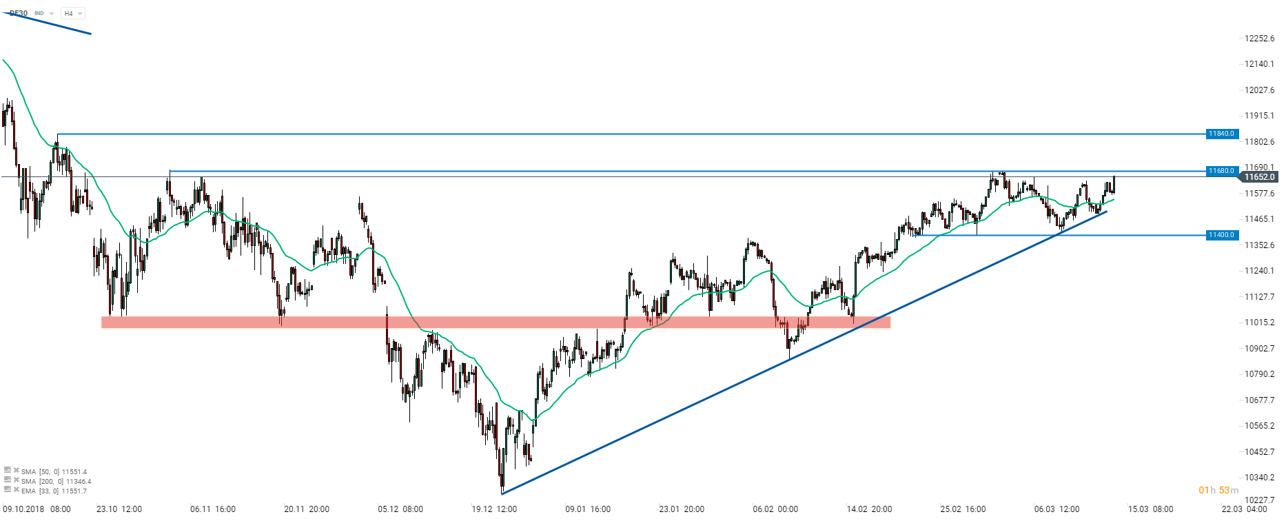 A pesar de un breve retroceso en la sesión de ayer, el DE30 alemán (subyacente de futuros DAX) abrió el jueves con una fuerte subida. El índice de referencia rompió por encima de la resistencia de 11600 pts y continuó subiendo hasta alcanzar un nuevo máximo semanal. El índice podría intentar romper por encima del nivel de resistencia en 11680 pts de hoy. Superando este nivel se dejaría camino hacia 11850 pts de área abierta. Fuente: xStation5