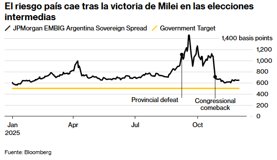 En ese momento, el peso se hundió, los bonos en dólares llegaron a rendimientos superiores al 17%, y la situación obligó a Washington a ofrecer apoyo financiero para contener la caída. Pero el escenario dio un giro decisivo después de las elecciones intermedias, en las que el oficialismo obtuvo más escaños de lo esperado, calmando a los inversores y fortaleciendo la posición del gobierno.