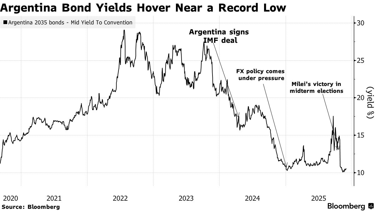 Hoy, los bonos soberanos operan cerca del 10% de rendimiento, niveles que coinciden con el rango en el que el ministro Luis Caputo ha indicado a los inversores que Argentina estaría dispuesta a volver a emitir deuda. Ese descenso vino acompañado de una marcada reducción del riesgo país, que retrocedió tras la victoria legislativa del oficialismo.
