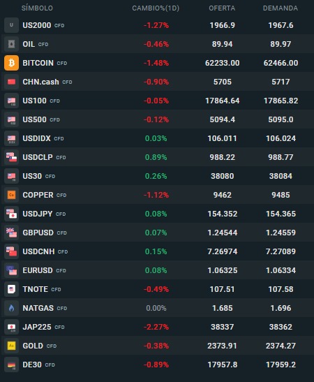 "Wall Street abre con ligeras alzas, mientras Europa y Asia cotizando con caídas. El oro nuevamente cuenta con factores alcista y queda nuevamente como protagonista de la semana. El dólar index actúa como activo refugio producto de la escalada en los conflictos de oriente medio pero también por que la fed está teniendo mayor margen para mantener las tasas altas por más tiempo debido a los últimos datos que muestran que la economía estados unidos aún continua siendo resiliente.