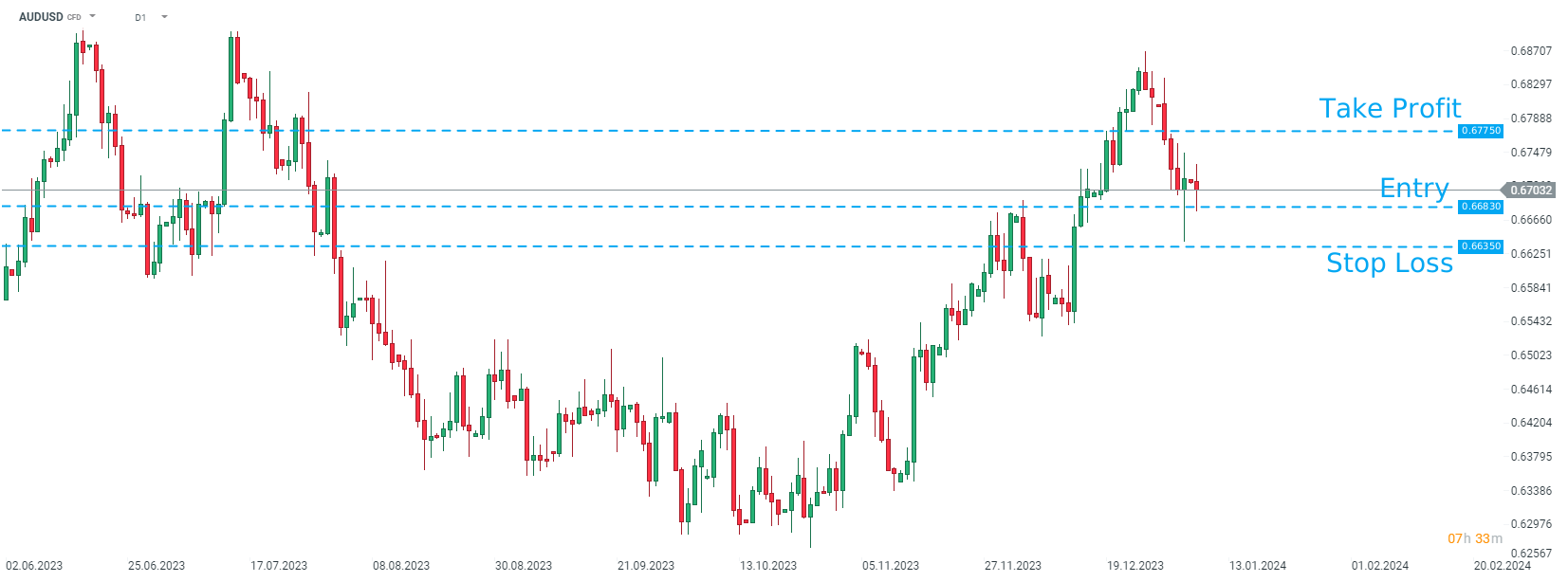 IFR recomienda tomar una posición larga en AUDUSD a precio de mercado con un objetivo de 0,6775 y una orden de stop loss colocada en 0,6635. Fuente: xStation5
