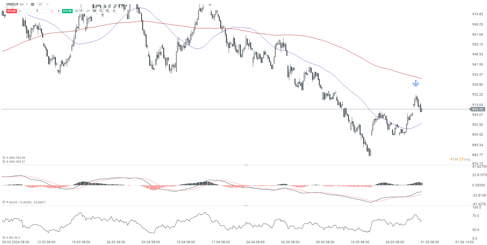 Tras mostrar mejoras en la parte comercial, el tipo de cambio mostro una señal de fortalecimiento, ubicando el precio actualmente en los 912, en terminos tecnicos osciladores continuan mostrando señales bajistas, por lo que el peso chileno podria continuar a la baja mientras la economia chilena continúe mostrando mejores perspectivas economicas.