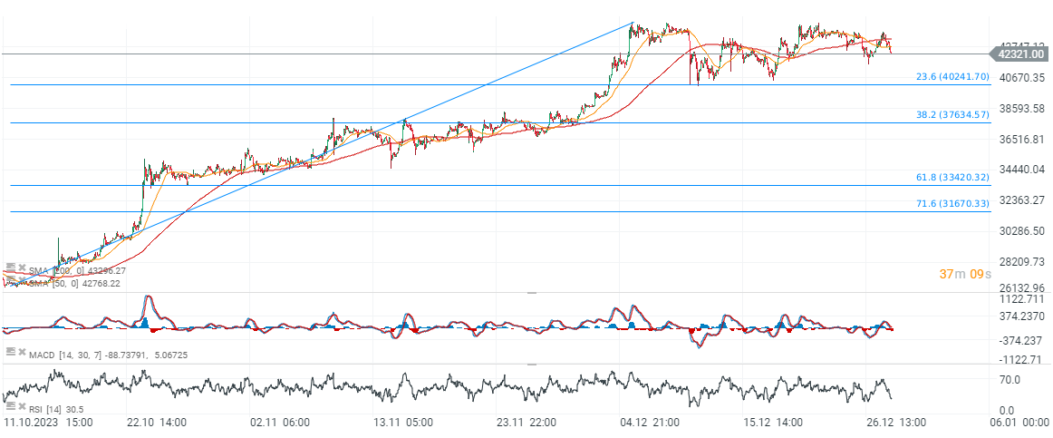 El nivel de soporte base en el escenario de corrección para Bitcoin sigue siendo el nivel psicológico de $40,000, donde vemos el retroceso de Fibonacci de 23,6 de la onda ascendente de octubre de 2023, así como reacciones de precios anteriores. Fuente: xStation5