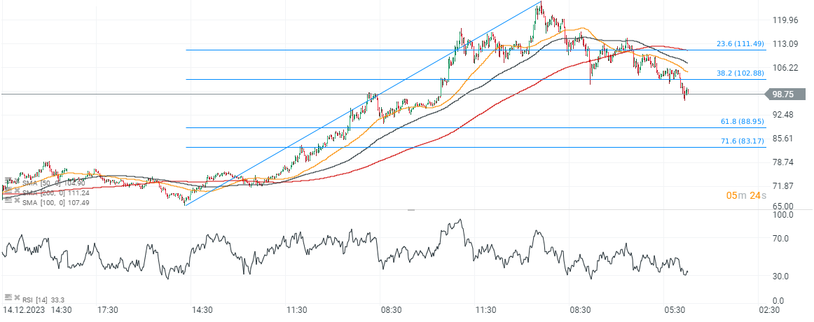Solana ha detenido las caídas en la importante zona psicológica de los 100 dólares, también respaldada por los máximos locales de hace una semana, pero no logró mantenerse por encima. Una caída a 89 dólares (61,8 retroceso de Fibonacci de la onda ascendente del 18 de diciembre) sigue siendo posible, en caso de que Bitcoin se acerque a la zona de los 40.000 dólares. Fuente: xStation5