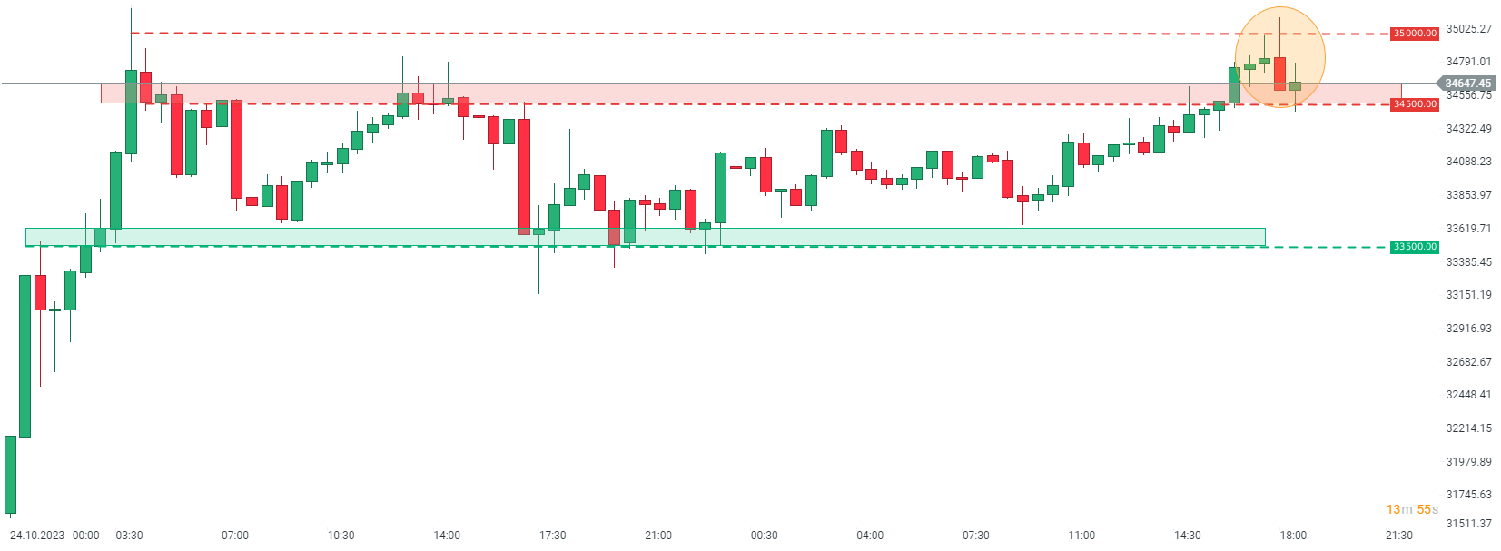 Al observar BITCOIN en un intervalo de 30 minutos, podemos ver que después de un período de negociación en un rango de $33,500-34,500, el precio rompió por encima del límite superior y subió a un nuevo máximo diario cerca de $35,100. Sin embargo, el intento de extender los beneficios por encima de este nivel resultó ser un fracaso y se genero un retroceso. Actualmente, están intentando mantener el precio por encima del límite superior del mencionado rango de negociación en el área de $34,500.
