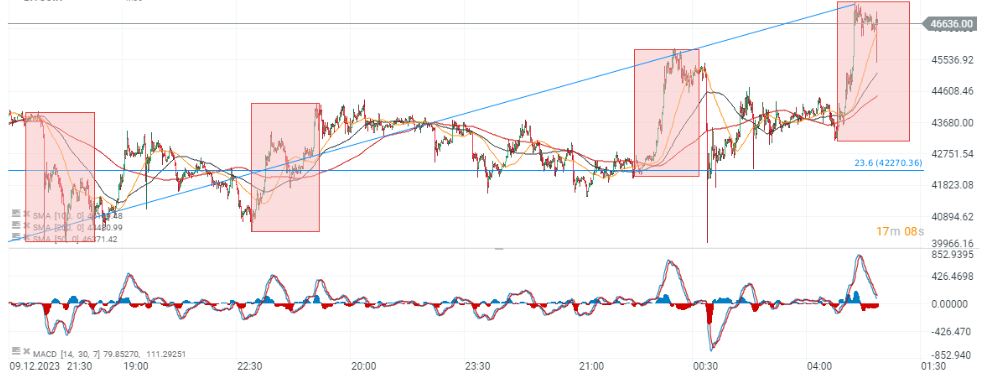 La mayor de las criptomonedas detuvo sus caídas tras una corrección dinámica que alcanzó los 45.500$. Actualmente, los alcistas han vuelto a superar los 46.500$, pero parece que antes de la decisión de la SEC, el Bitcoin puede tener dificultades para alcanzar nuevos máximos este año. Si observamos el rango de los tres principales movimientos de precios anteriores, en caso de una nueva corrección, el precio de Bitcoin podría probar el área entre 42.000$ y 43.000$, donde vemos reacciones de precios anteriores y el retroceso de Fibonacci de 23,6 de la onda ascendente de octubre de 2023. Aun así, no se puede excluir el movimiento alcista y la clave puede ser el nivel de soporte psicológico de 50.000 dólares.