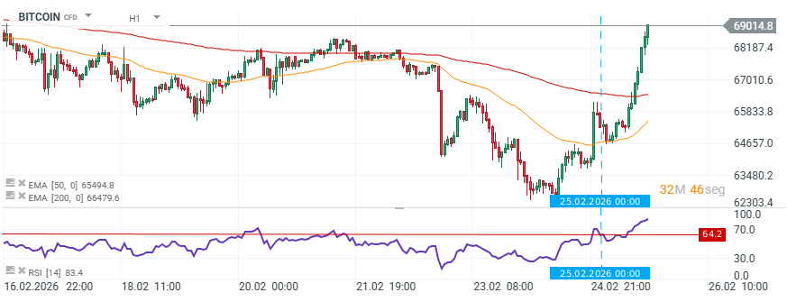 El gráfico muestra un movimiento de recuperación agresivo. El precio de BITCOIN logró posicionarse por encima de la EMA de 200 periodos situada en 66,479.6 dólares y de la EMA de 50 periodos en 65,494.8 dólares. Esta es una señal alcista de corto plazo que valida el quiebre de la tendencia negativa previa y lleva al activo a testear niveles de resistencia cerca de los 70,000 dólares.