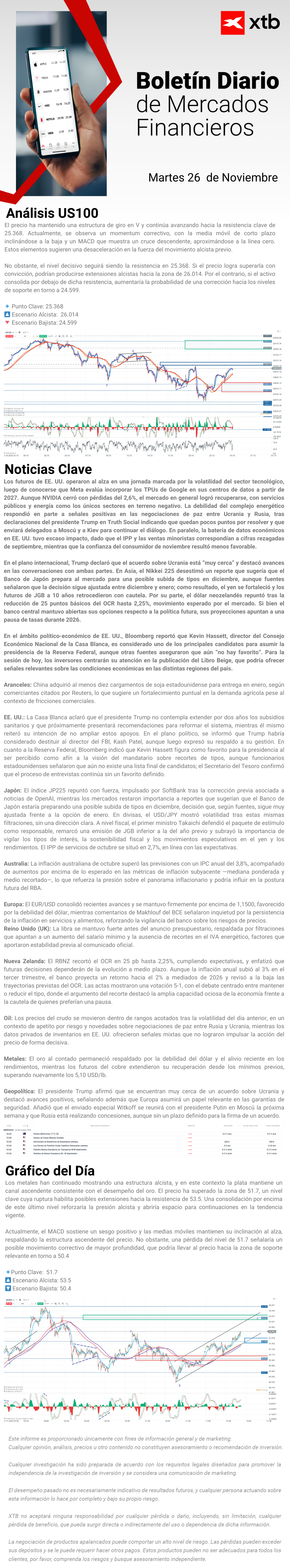 Este material ha sido elaborado por XTB. Su contenido tiene fines exclusivamente informativos y no constituye, en ningún caso, una asesoría personalizada ni una recomendación de inversión sobre instrumentos, mercados o estrategias específicas. La información aquí contenida no considera los objetivos, la situación financiera ni el perfil de riesgo de ningún inversionista en particular. Antes de invertir en cualquier instrumento financiero, le recomendamos informarse sobre los riesgos involucrados y verificar si el producto es adecuado para su perfil. El desempeño pasado no garantiza resultados futuros. Toda decisión de inversión basada en este material será responsabilidad exclusiva del inversionista. XTB Agente de Valores SpA no se hace responsable por pérdidas directas o indirectas, incluidos daños patrimoniales o pérdida de beneficios, derivados del uso o confianza depositada en esta información.
