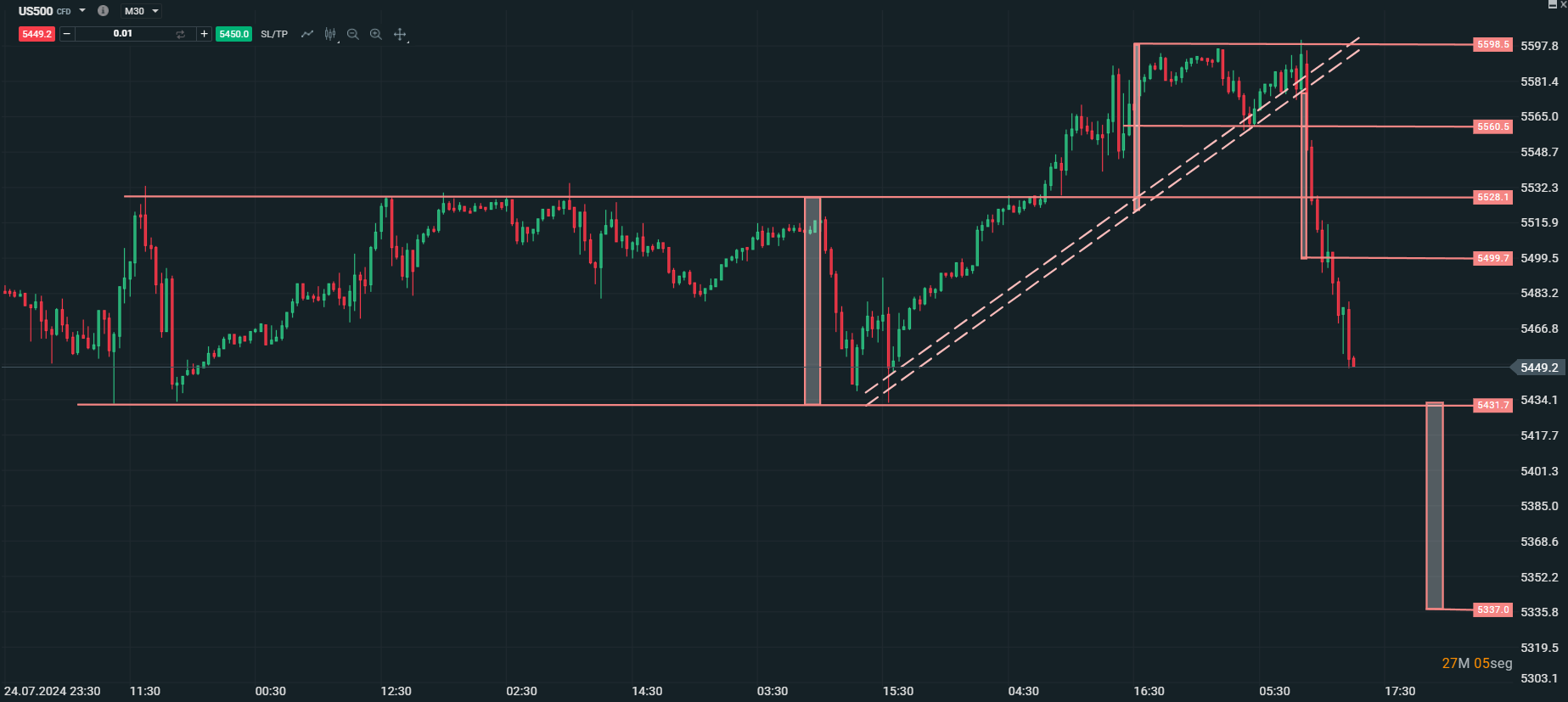 El índice US500 experimentó una caída significativa del 2.62%, situándose en 5448 puntos tras la publicación de los datos ISM, que mostraron un resultado de 46.8, por debajo del consenso de 48.5. Esta caída devuelve al índice al rango lateral de 5528.1 - 5431.7 puntos. Si el precio rompe por debajo de este rango, podríamos ver un retroceso hacia los 5337 puntos.
