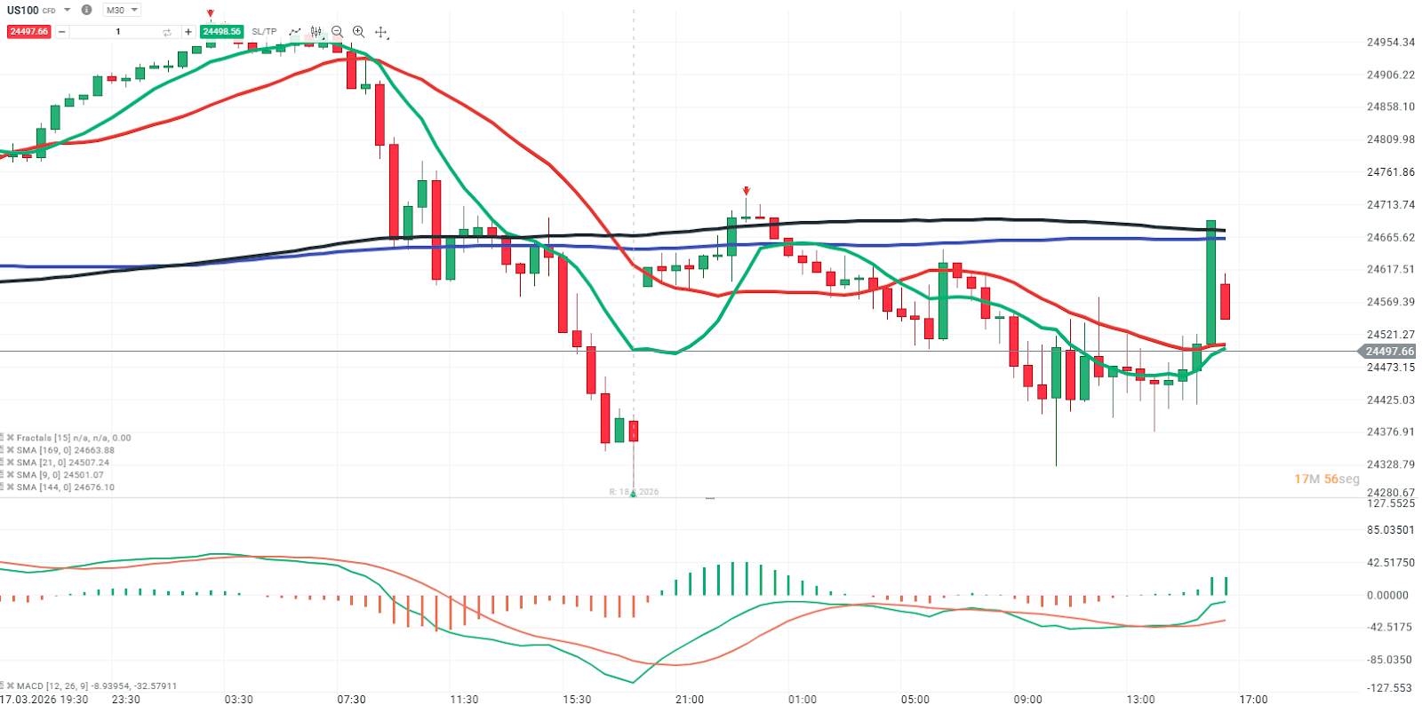 El índice mostró un rebote técnico tras la caída previa, impulsado por la corrección del petróleo y la baja en los rendimientos, aunque la estructura de fondo sigue siendo frágil. Actualmente, el precio se ubica en torno a los 24.500 puntos, intentando estabilizarse tras un tramo bajista.