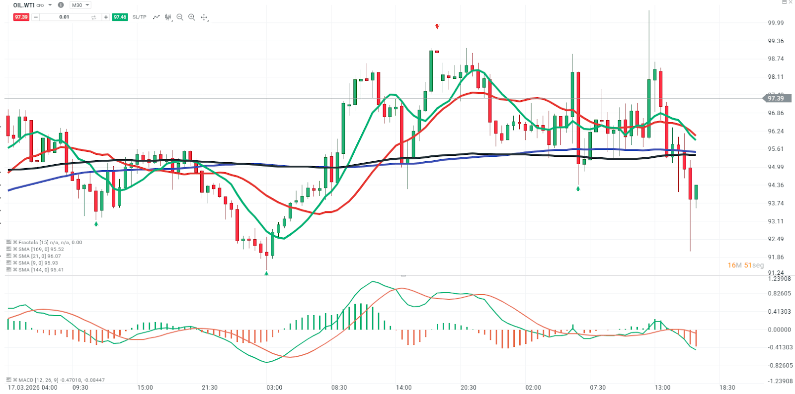 El petróleo ha entrado en una fase de alta volatilidad tras el spike reciente, mostrando una corrección agresiva desde máximos cercanos a los 100 dólares. Actualmente, el precio se ubica en torno a los 94 – 95 dólares por barril, tras una fuerte liquidación intradía.