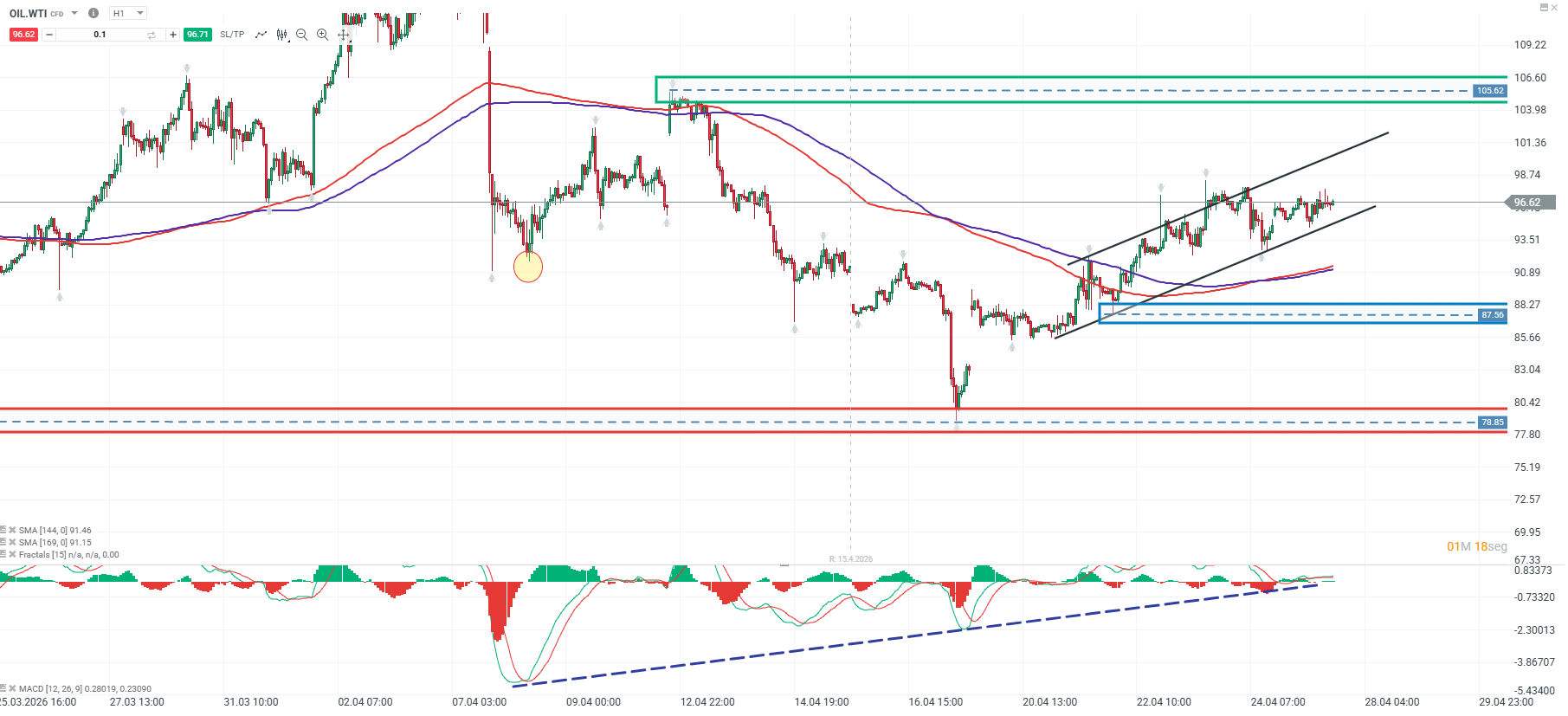 En este contexto, mientras el precio se mantenga por sobre el nivel de 87,56, podría sostener la continuidad del movimiento dentro del canal, teniendo como principal referencia de resistencia el nivel de los 105,62 dólares. Por el contrario, una ruptura de este soporte podría reactivar la presión bajista, abriendo espacio para una caída hacia el soporte más relevante, correspondiente al mínimo registrado el 17 de abril en torno a los 78,85 dólares.