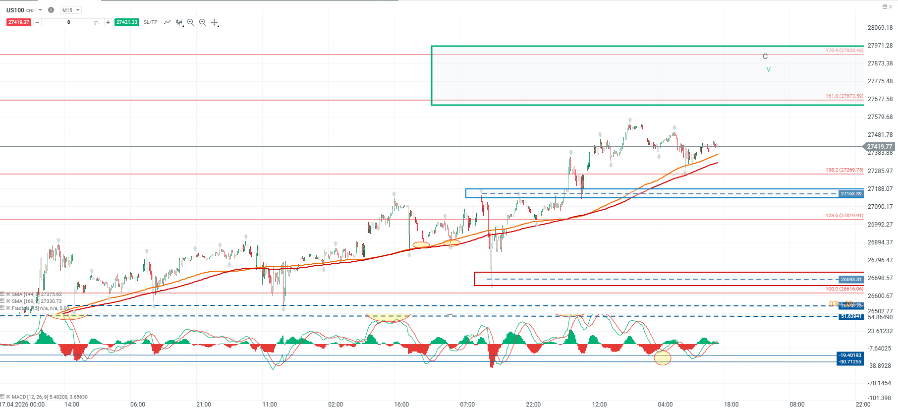 El precio ha mantenido una estructura de máximos y mínimos crecientes, registrando un nuevo máximo reciente. Actualmente, se observa un retroceso en dirección a su media móvil de largo plazo, mientras continúa cotizando sobre la zona de soporte relevante en torno a los 27.163 puntos, nivel que se mantiene como referencia clave. Asimismo, el indicador MACD ha alcanzado una zona de soporte desde la cual previamente se han generado nuevos impulsos alcistas.