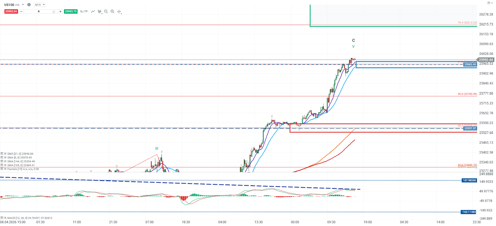 El precio ha extendido su movimiento hasta la resistencia correspondiente al retroceso de Fibonacci del 61,8%, ubicada en los 25.962 puntos del impulso previo. Este nivel constituye una referencia clave dentro de la estructura alcista, ya que una consolidación sostenida por sobre este umbral podría habilitar una continuación del movimiento hacia la siguiente zona de resistencia en los 26.212 puntos, correspondiente al nivel del 76,4%.
