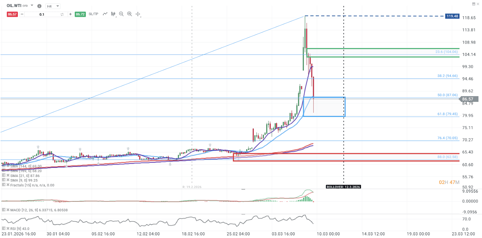 El petróleo registró una fuerte reversión bajista después de haber alcanzado máximos en la zona de 119, lo que provocó un retroceso hasta el nivel de 61,8% de Fibonacci. Este nivel coincide con un soporte técnico clave ubicado en torno a 69,45, una referencia relevante para evaluar la evolución del precio en el corto y mediano plazo. Mientras esta zona se mantenga vigente, el mercado podría comenzar a mostrar señales de estabilización y eventual recuperación.