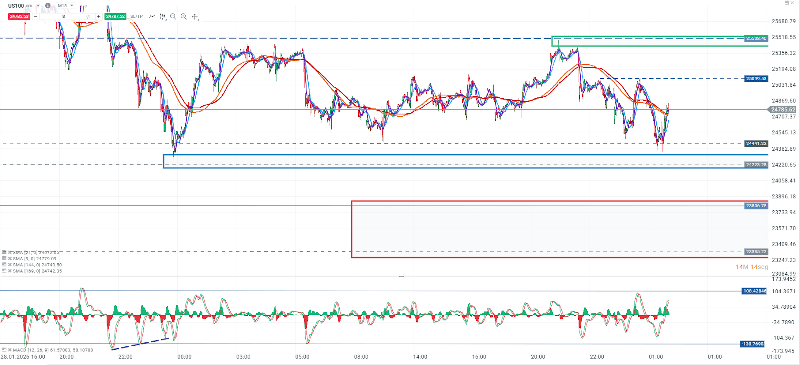 El precio ha logrado sostener la zona de soporte en torno a los 24.441 puntos, desde donde ha retomado la presión alcista. Esta reacción mantiene una lectura positiva en el corto plazo, apoyada además por un MACD con estructura favorable y por la cotización sobre su media móvil de largo plazo.