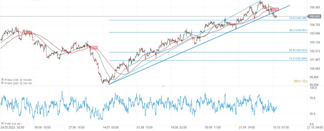 Los contratos del índice del dólar cotizan hoy con poca volatilidad, ganando un 0,04%. El promedio SMA100 ha cruzado el SMA200 desde arriba, formando una formación de "cruz de la muerte". Si miramos hacia atrás, formaciones similares (rectángulos rojos) precedieron períodos de debilidad del dólar ligeramente más prolongados (lo que, por supuesto, no determina que la situación vaya a ser mejor). Esta vez es similar, el principal nivel de soporte se encuentra en 105,2 (el retroceso de Fibonacci de 38,2 de la onda ascendente de julio de este año).