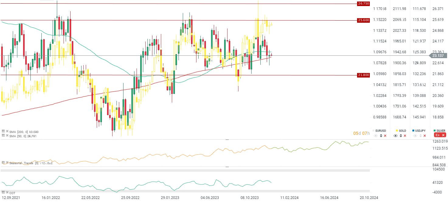 En el gráfico semanal se hace evidente una divergencia notable entre la plata y el oro. La plata ha demostrado resistencia frente a caídas más pronunciadas, manteniéndose por encima del promedio móvil de 200 semanas, mientras que está ligeramente por debajo del promedio móvil de 50 semanas. Esta divergencia plantea preguntas intrigantes sobre las valoraciones relativas de los dos metales preciosos.