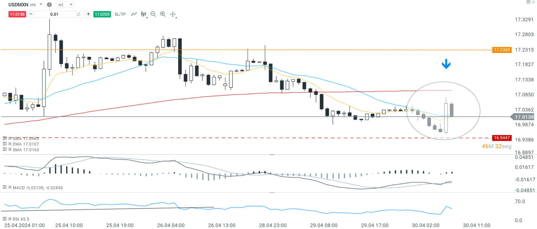 Los precios del tipo de cambio mexicano tratan de suavizar la fuerte vela alcista provocada por la alza del dòlar durante la apertura de la mañana, el precio actualmente se encuentra en los 17.0260 y continua sobre el soporte clave de los 16.9447. Fuente: xStation 5