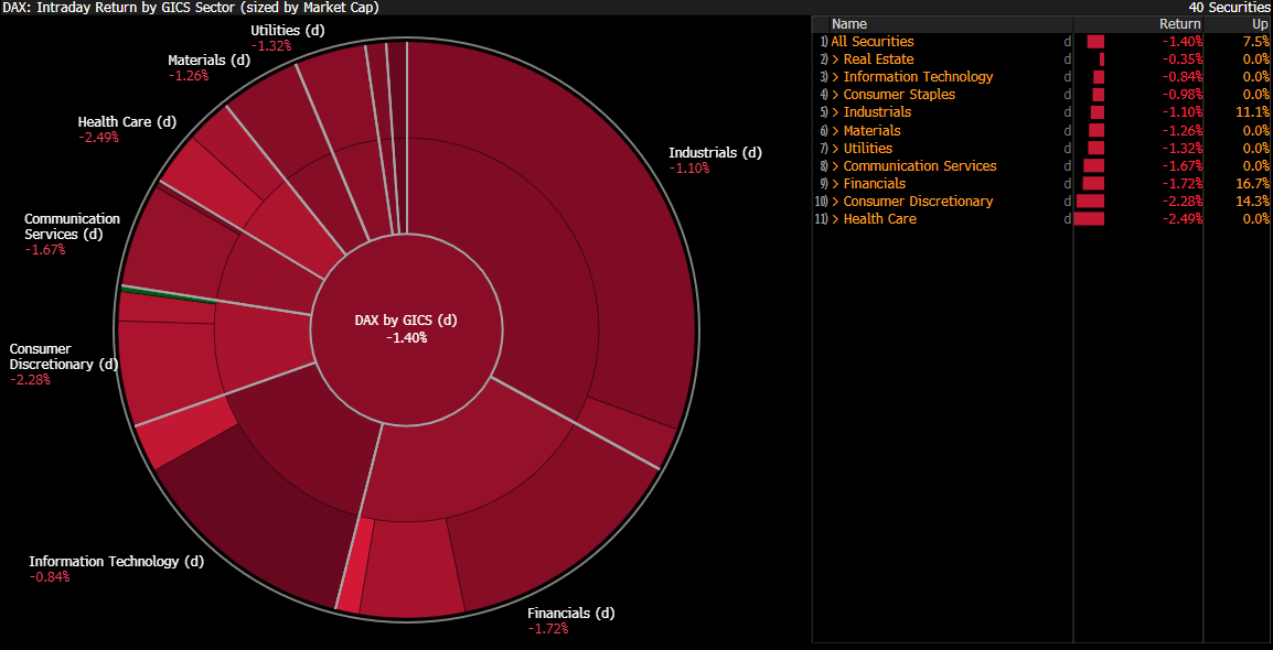 Entre los sectores más débiles dentro del índice alemán se encuentran salud, bienes de consumo y finanzas. En este momento, no hay un solo sector mostrando alzas. Fuente: Bloomberg Finance L.P.