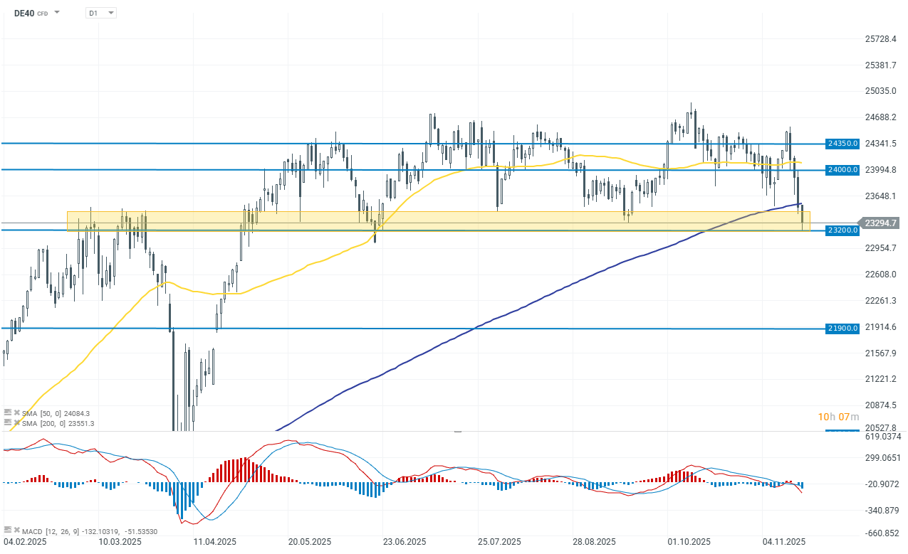 El índice alemán está poniendo a prueba un soporte importante por encima de los 23,200 puntos. Este nivel constituye el límite inferior del canal de consolidación en el que el índice ha operado desde abril de este año.
