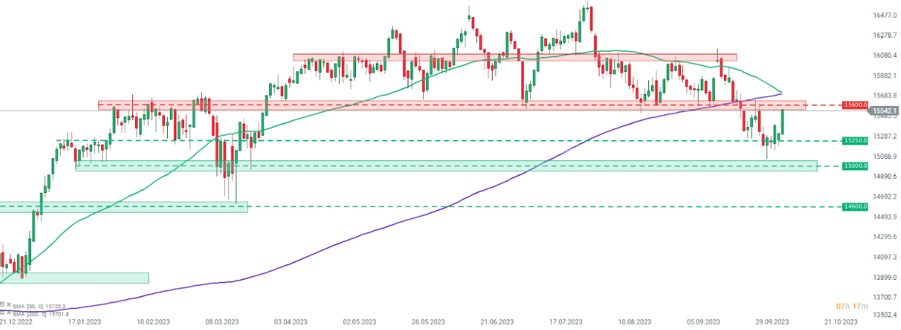El DAX alemán cotiza un 1,5% más hoy y vuelve a subir por encima de los 15.500 puntos en medio de una mejora general del humor en los mercados. El índice se acerca a una zona de resistencia clave de mediano plazo en el área de los 15,600 pts. Fuente: xStation5