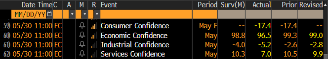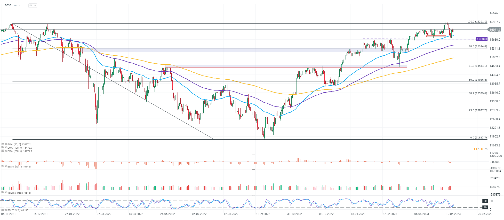 La sesión del martes en los mercados europeos trae una ligera mejora en el sentimiento de los inversores, y los inversores reaccionan todo el tiempo a los comentarios optimistas sobre el límite de la deuda de EE.UU. El DAX alemán prolonga hoy el impulso correctivo tras las recientes caídas y sube por encima de la barrera de los 16.000 puntos. La atención de los inversores se centrará principalmente en las lecturas del Conference Board y la FED de Dallas de EE.UU. hoy. El sentimiento de la eurozona se ha deteriorado desde la última lectura.
