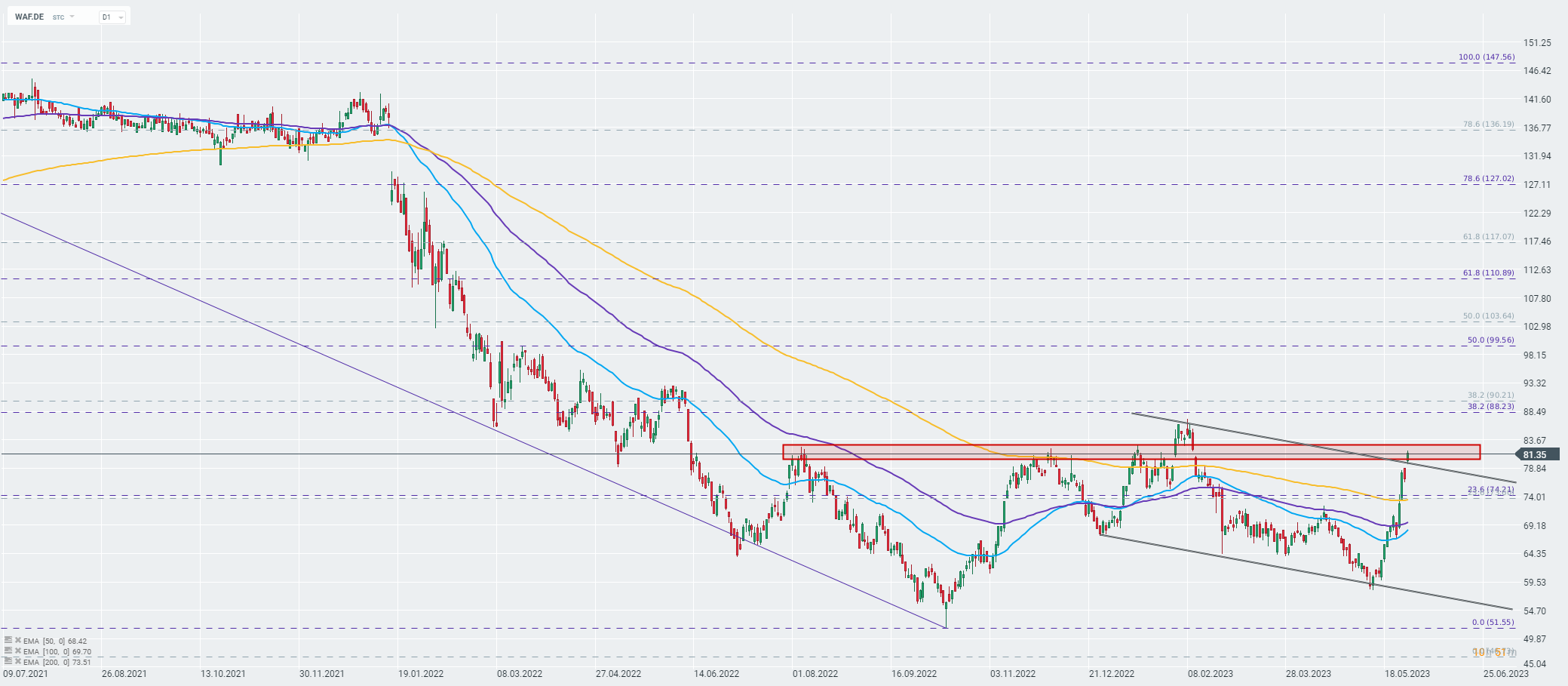 Acciones de Siltronic (WAF.DE), intervalo D1. Actualmente, las acciones están luchando por superar la estructura de resistencia definida por los picos locales probados anteriormente. Fuente: xStation 5