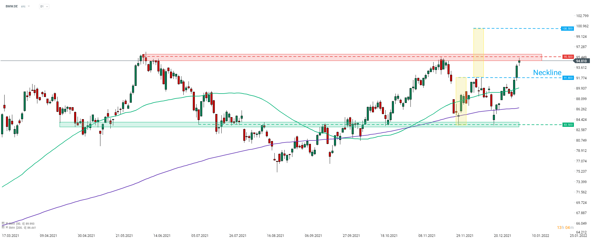 A pesar de la escasez de semiconductores, BMW (BMW.DE) logró vender un número récord de automóviles de la marca BMW en 2021. Las acciones están probando la zona de resistencia en 95,50 €, marcada con máximos de 2021. El movimiento alcista en curso se lanzó después de que se pintara un patrón de doble suelo en la zona de los 83,50 €. El rango de ruptura de este patrón apunta a un posible movimiento alcista hasta 100,50 €, el nivel más alto desde finales de 2015. Fuente: xStation5